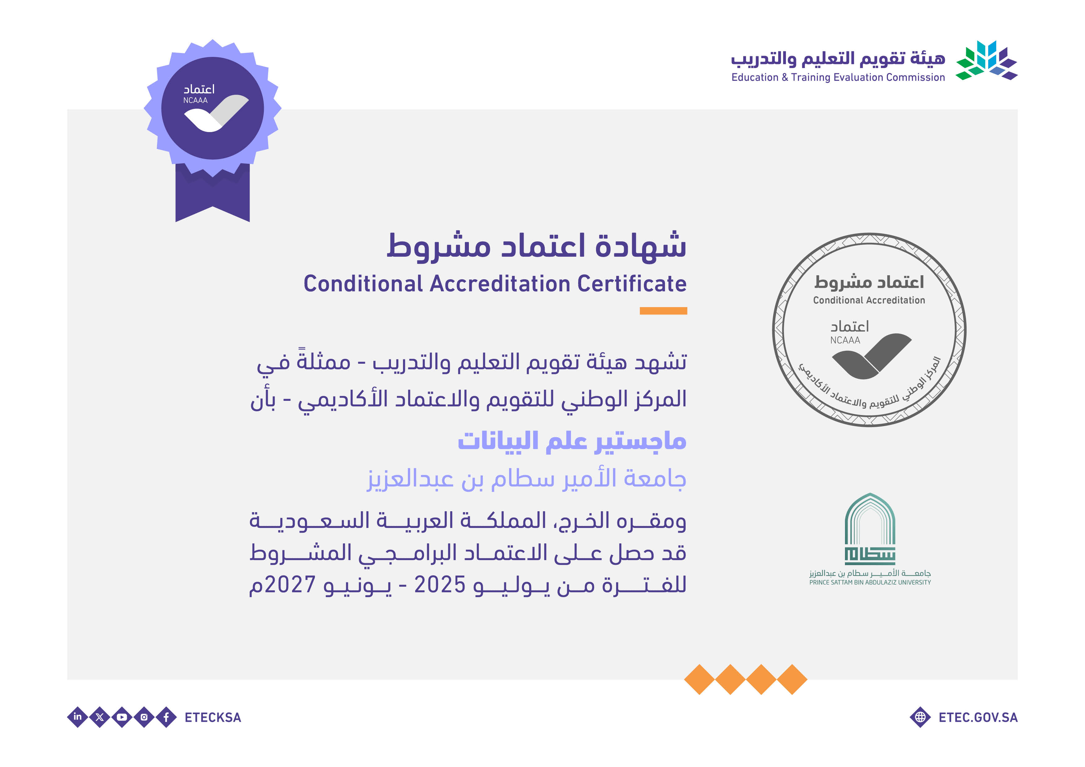 وتؤكد عمادة البحث والدراسات العليا أن الحصول على الاعتماد البرامجي يُعد مؤشرًا مهمًا على التزام الجامعة بتحقيق معايير الجودة الوطنية، وضمان مخرجات تعليمية تسهم في تلبية احتياجات سوق العمل وتعزيز مسيرة التنمية المستدامة.
