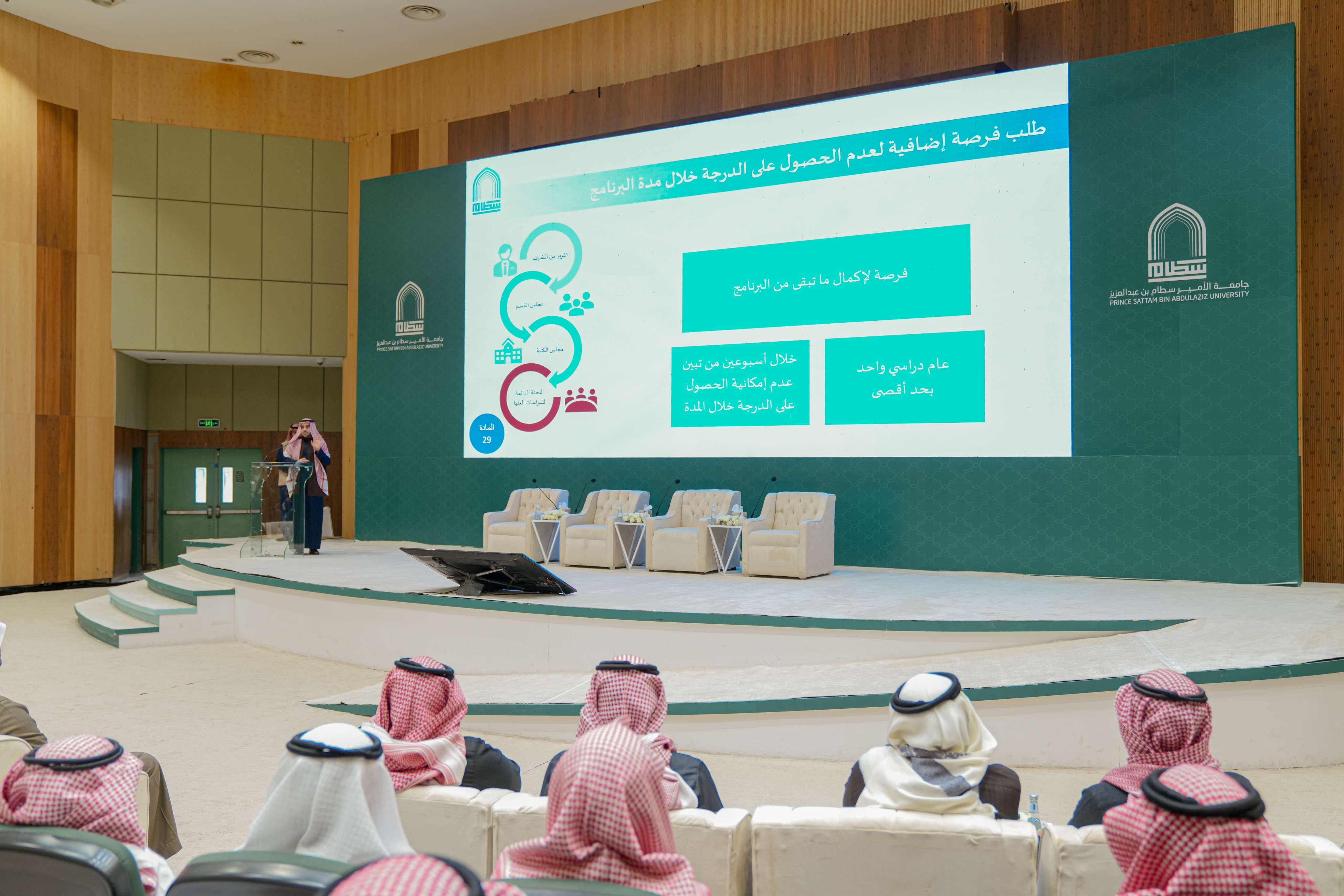 كما تم استعراض حقوق وواجبات طلبة الدراسات العليا، والخدمات المتاحة لهم لدعم مسيرتهم الأكاديمية. واختتم اللقاء بفقرة للإجابة على أسئلة الطلبة واستفساراتهم، حيث تم الاستماع إلى ملاحظاتهم وتقديم التوجيهات اللازمة لضمان بداية موفقة لمسيرتهم الدراسية.